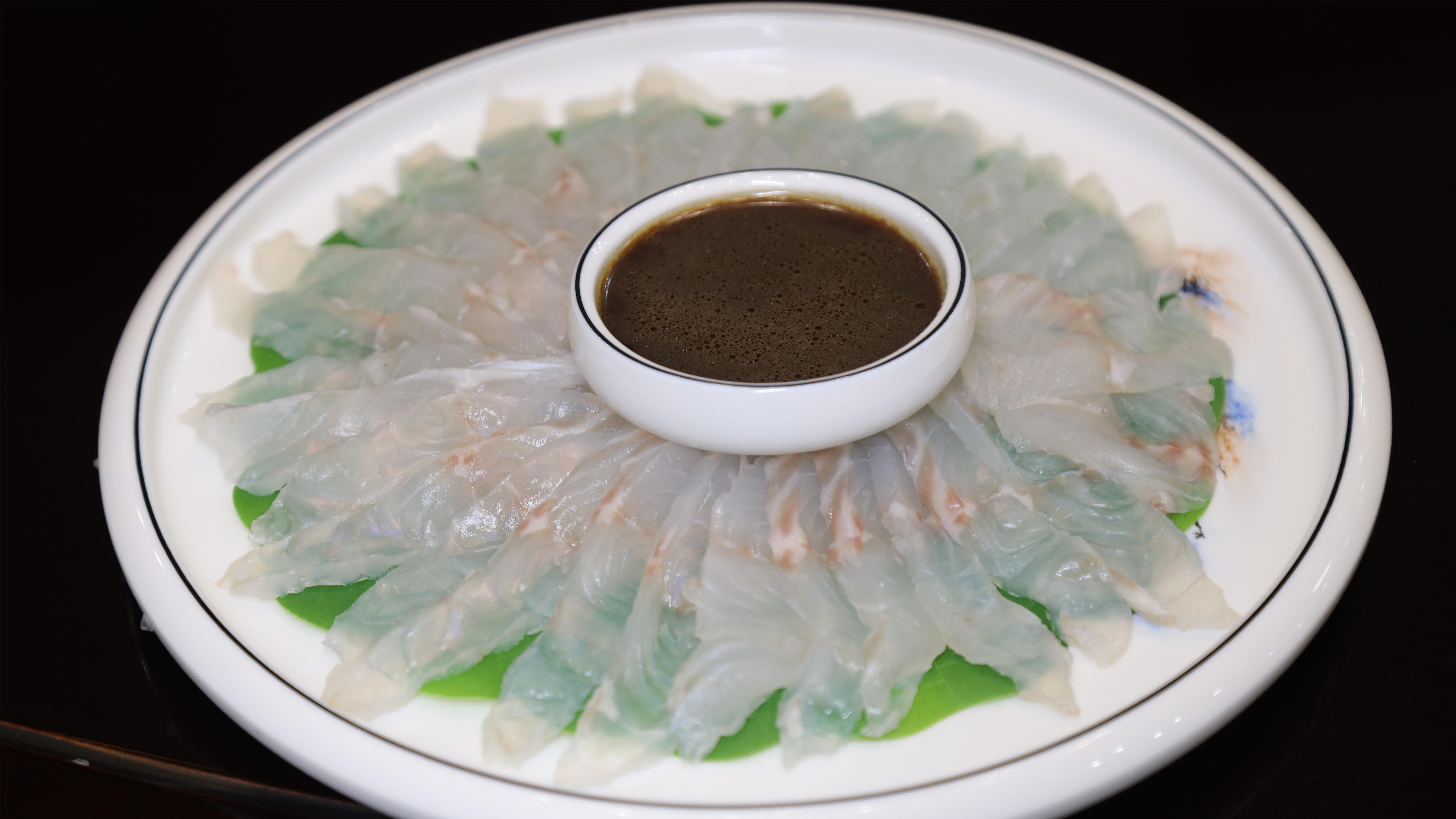 ③将鱼肉切成薄片,放在冰上、摆盘;