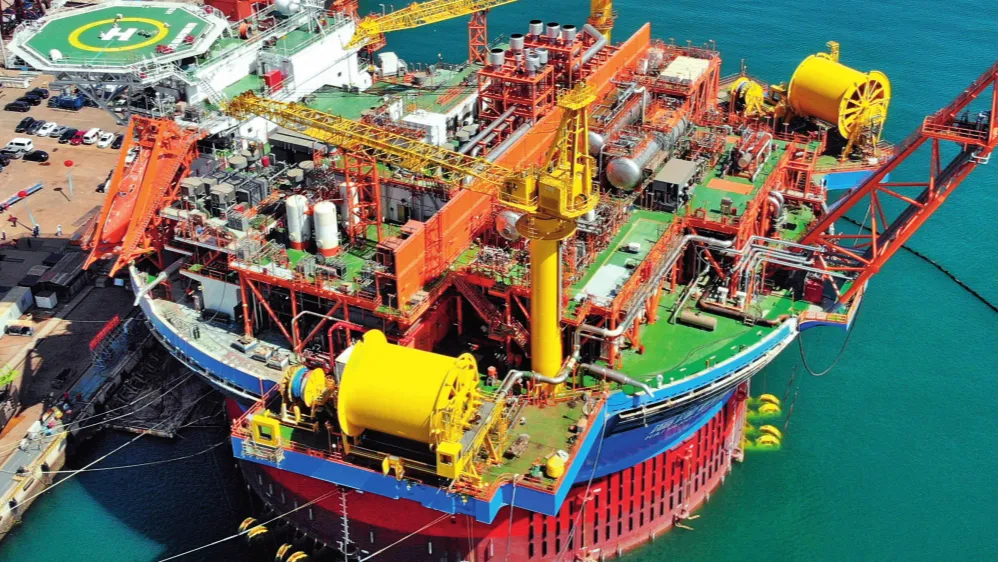 由我国自主设计建造的亚洲首艘圆筒型浮式生产储卸油装置 (FPSO)“海葵一号”在山东青岛完工交付,标志着我国深水油气装备自主设计建造关键技术取得重大突破(2024 年 4 月 26 日摄) 李紫恒摄 / 《瞭望》