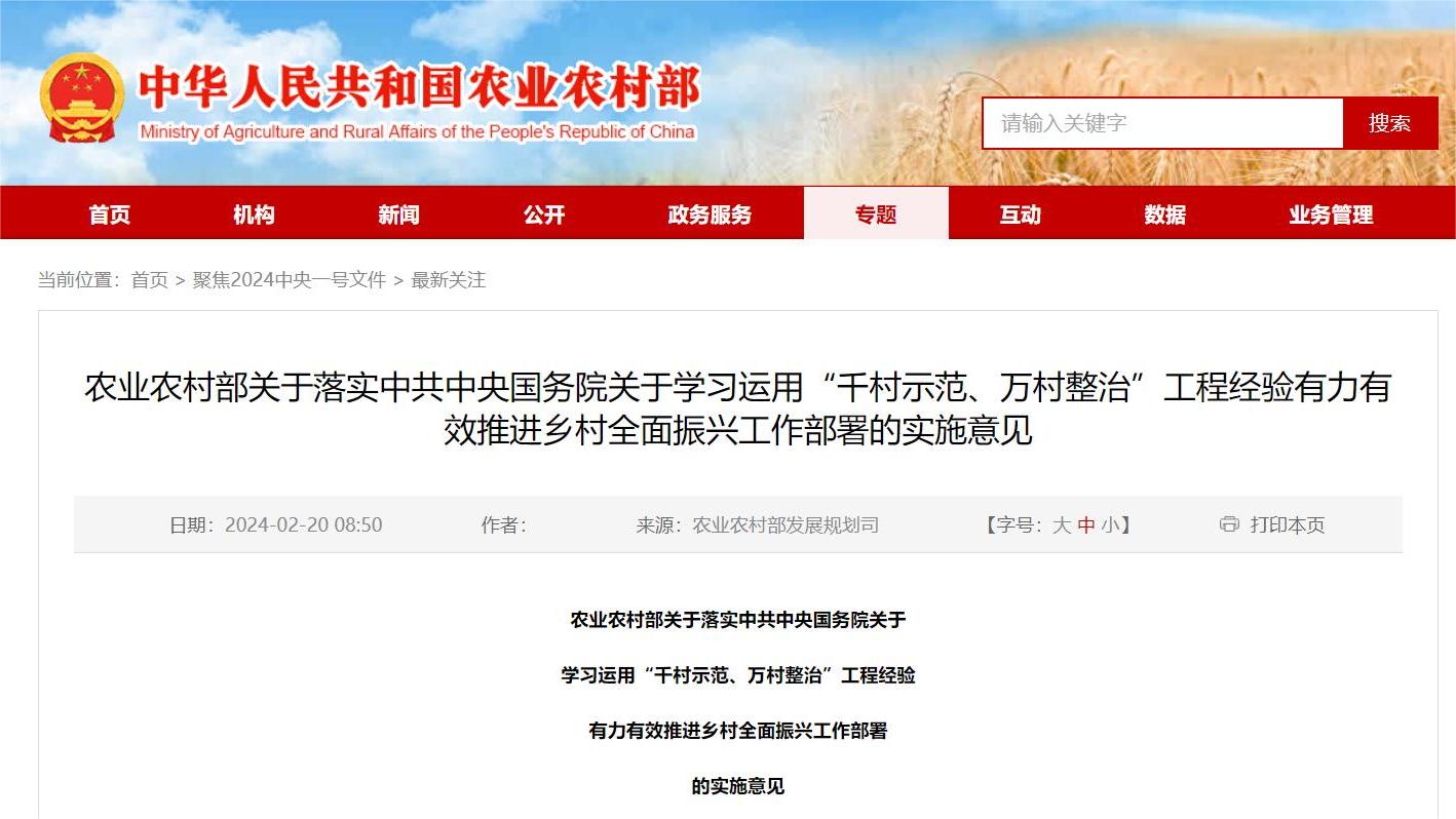 近日,农业农村部印发《关于落实中共中央国务院关于学习运用“千村示范、万村整治”工程经验有力有效推进乡村全面振兴工作部署的实施意见》(农发〔2024〕1号)(以下简称《实施意见》)。《实施意见》在多个部分对渔业渔政工作作出重要部署,相关内容摘编如下。