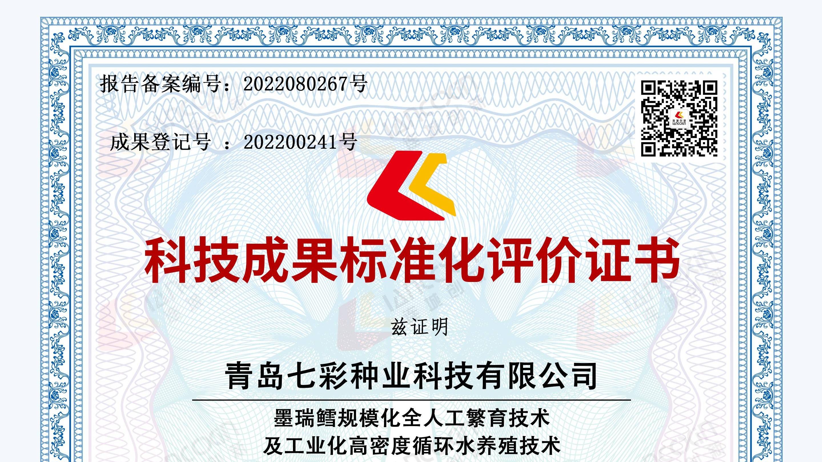 2022年8月24日,莱西市科技创新部根据青岛市科技局关于成果登记的相关要求,对6项成果进行为期一周的登记公示,其中包括青岛七彩种业科技有限公司关于“墨瑞鳕规模化全人工繁育技术及工业化高密度循环水养殖技术”的成果登记,经科技成果标准化评价,该项技术被认定为国际领先水平。